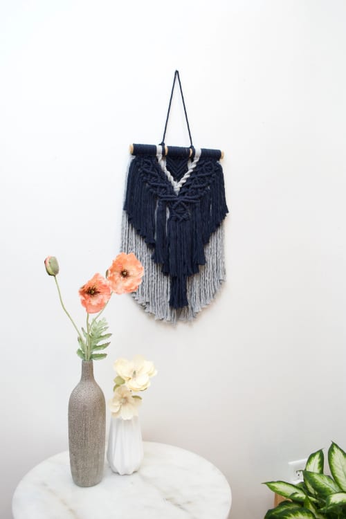 navy blue and gray macrame wall hanging by a modern take fiber art wescover macrame wall hanging