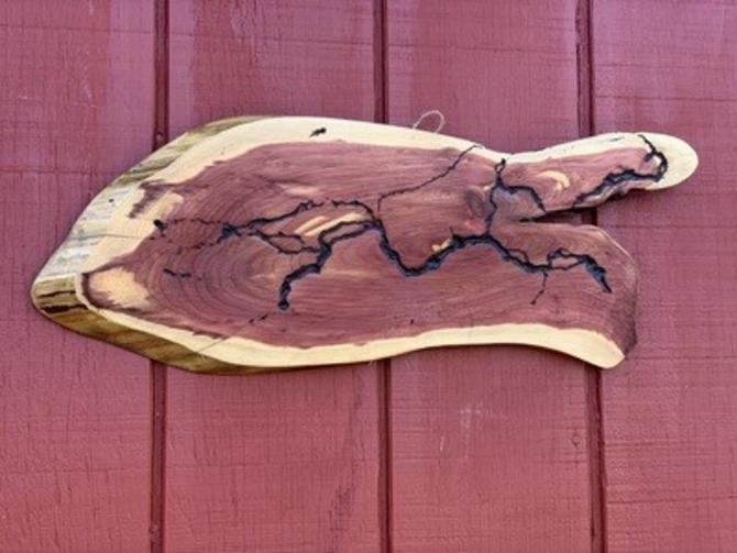 live edge wood wall art, cedar "fish" from artified junk rescue of northern va attic