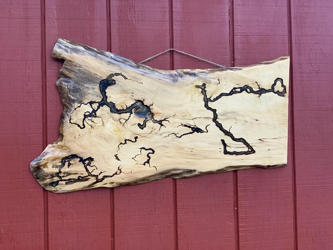walnut wall art with rock filled epoxy river anglewood live edge custom furniture, toronto
